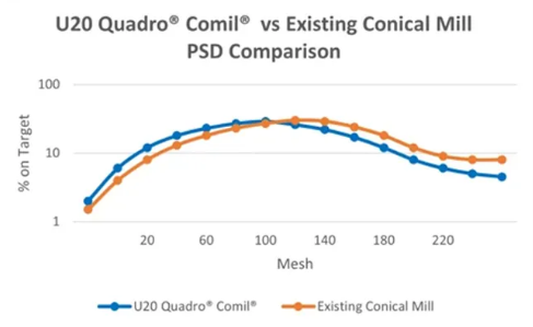 客户使用现有的锥形整粒机和U20 Quadro® Comil®分别加工了几批相同的产品,并比较了以下指标: