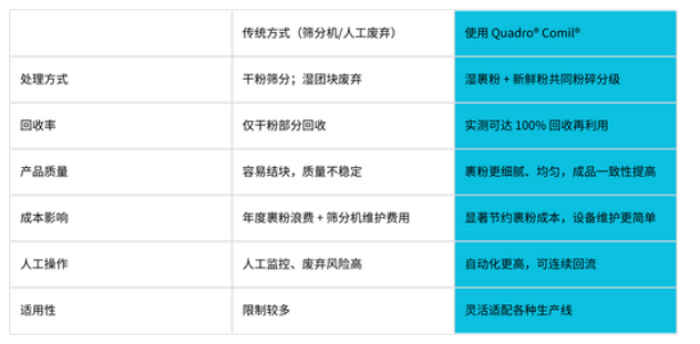 我们采用 Quadro® Comil® 粒度控制技术,将湿裹粉与少量新鲜粉料一起粉碎,使其重新获得稳定粒度,可再次回流生产线,完全替代新鲜裹粉。