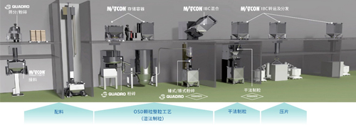 颗卓Quadro与费兹帕克Fitzpatrick联合打造的粉碎、整粒及筛分多功能生产平台适用于实验室规模、中试到大规模生产。 生产效果可直接放大,实现更为均匀的粒径分布(PSD)。通用的主机即可切换不同功能,是众多国际知名药厂选择的更具经济性的生产方案,满足不同生产需求。